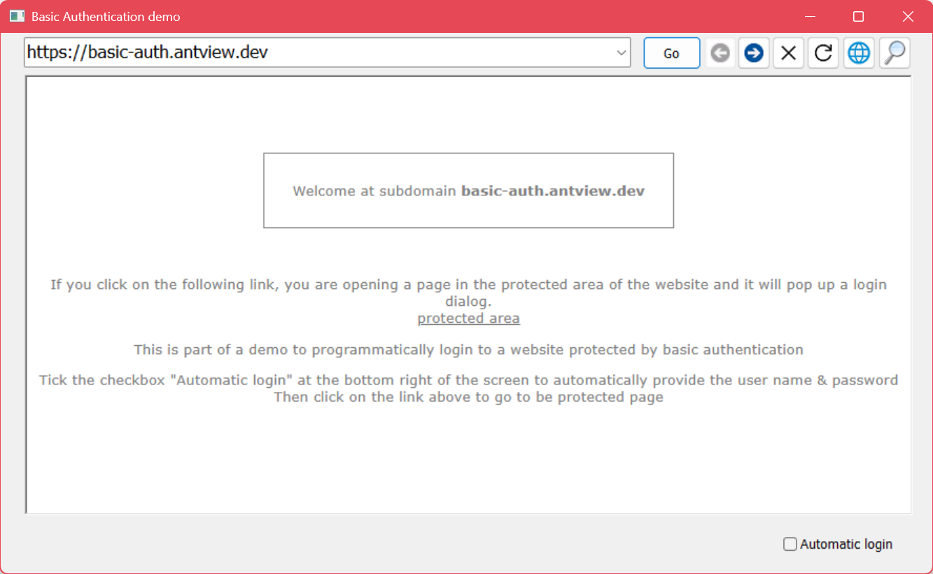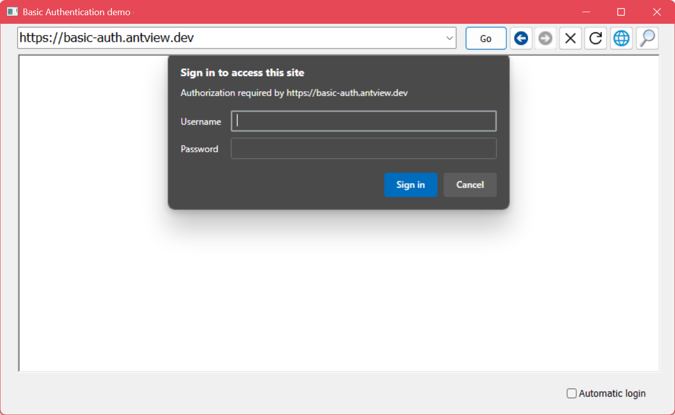 The only time the OnBasicAuthenticationRequested event triggers is when the web page has a basic authentication http request challenge. The args parameter is of type AntViewBasicAuthenticationRequestedEventArgs and provides a way to handle the response.